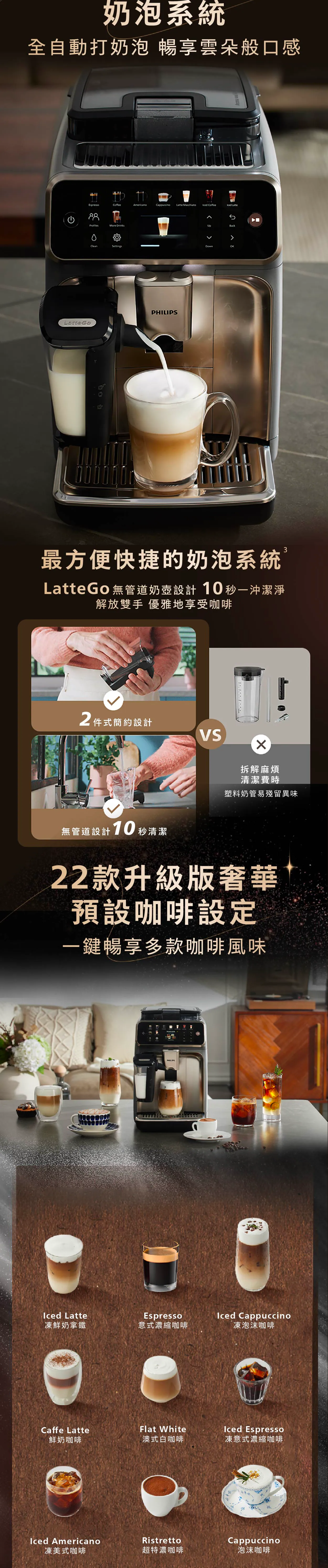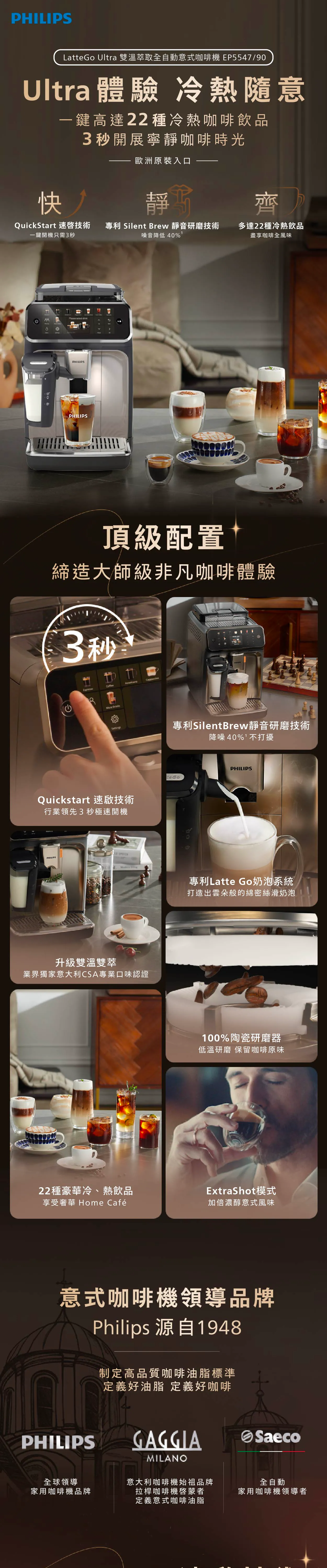 飛利浦 EP5547/90 LatteGo Ultra 雙溫萃取全自動意式咖啡機為您帶來完美的咖啡體驗,擁有獨特的雙溫控功能,讓您輕鬆享受美味咖啡。