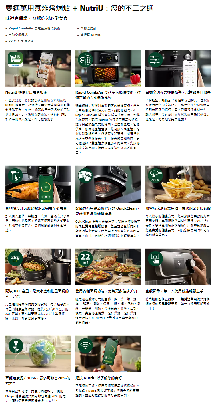 引導式烹調:將您的雙速萬用氣炸烤焗爐與 NutriU 應用程式相連接,無需大費周章即可炮製佳餚美食,NutriU 涵蓋來自世界各地的美味健康食譜,更可激發您的靈感。透過逐步指引和精準的個人設定,即可輕鬆炮製!