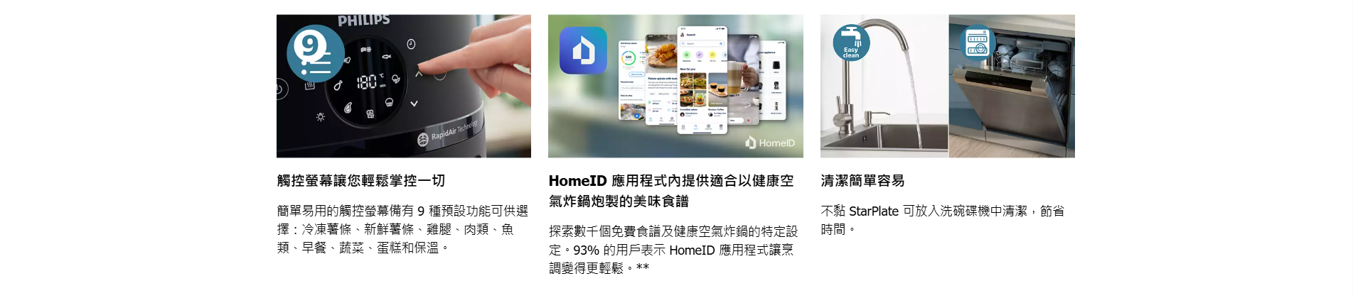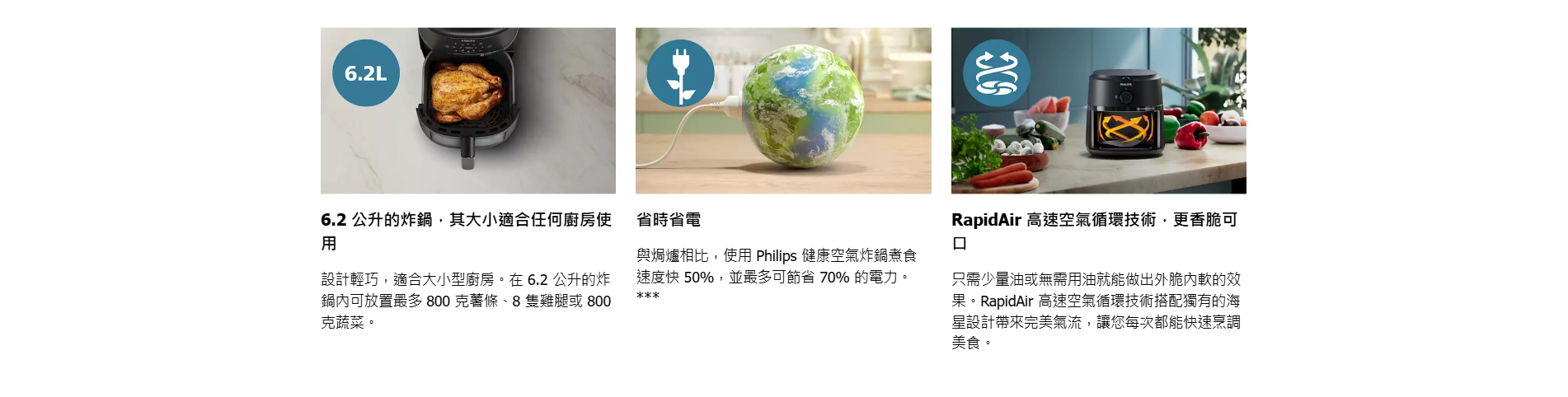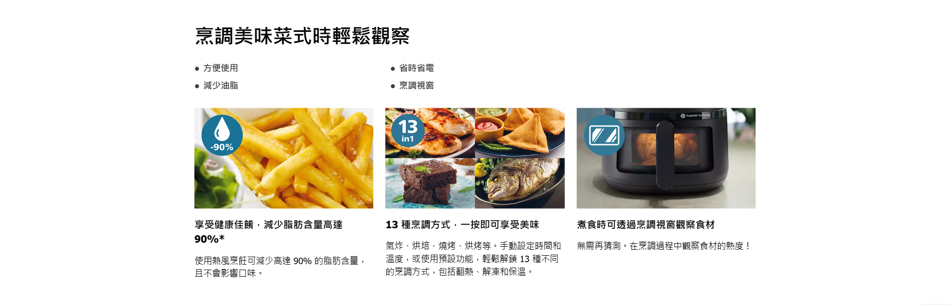Rapid Air 高速空氣循環技術,以其獨特的「海星」設計,令熱空氣旋轉,炮製出外脆內嫩的美味食物,能減少煎炸食物油脂多達 90%**