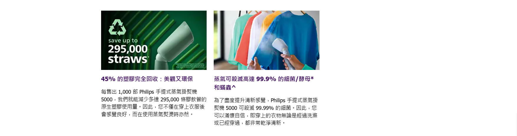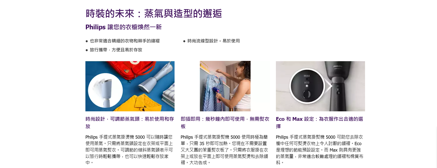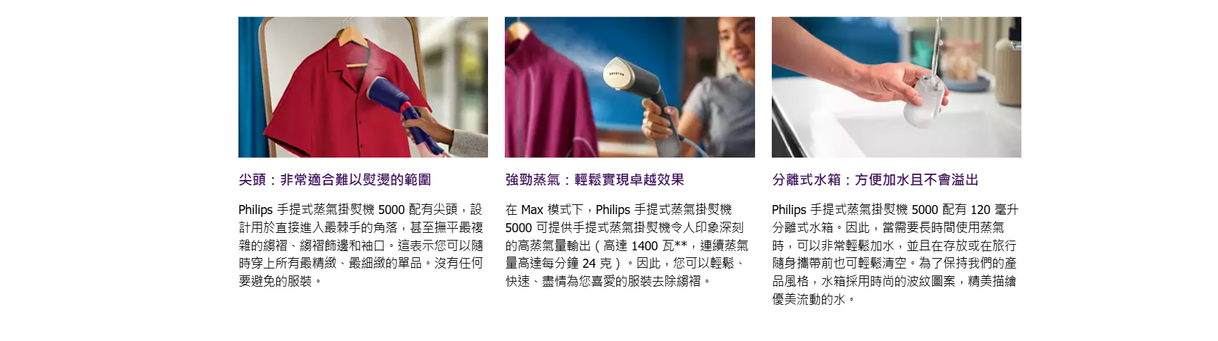PHILIPS 飛利浦 5000系列 手提式蒸氣掛熨機時裝的未來:蒸氣與造型的邂逅,您已經選擇了衣服,但沒有時間熨衣。別擔心,我們可以幫您!忘掉笨重的熨斗,使用 Philips 手提式蒸氣掛熨機 5000。35 秒內即可輕鬆使用。保證不會出現熨焦,極致時尚!