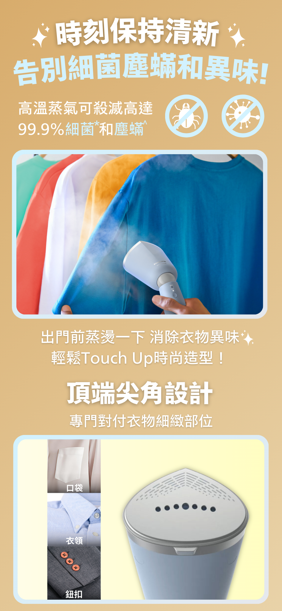 為了盡度提升清新感覺,Philips 手提式蒸氣掛熨機 5000 可殺滅 99.99% 的細菌。因此,您可以滿懷自信,即穿上的衣物無論是經過洗滌或已經穿過,都非常乾淨清新。