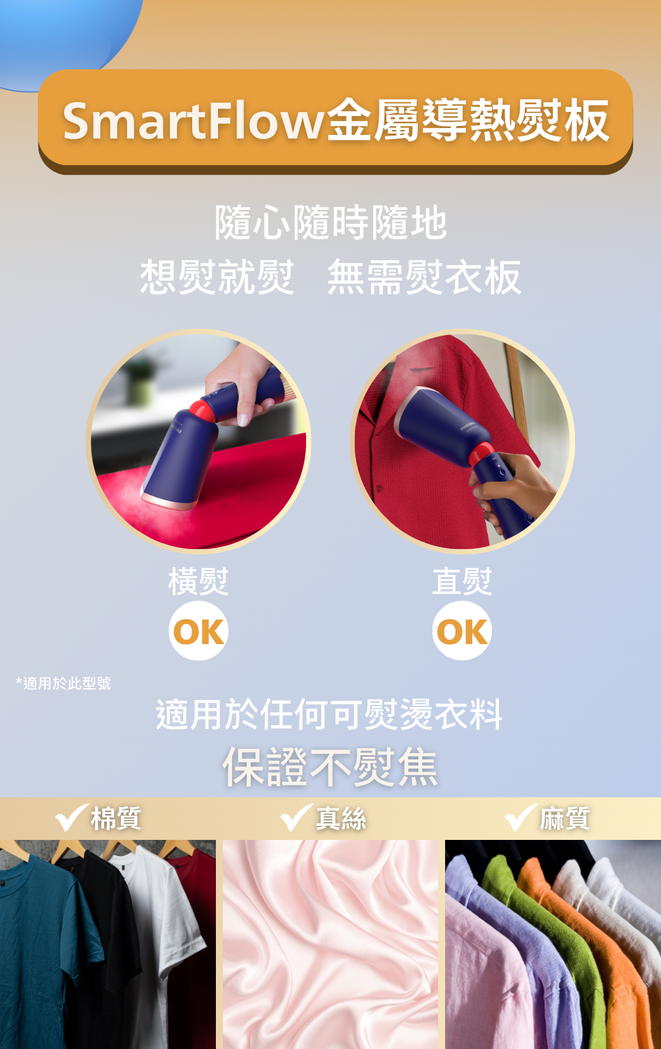Philips 手提式蒸氣掛熨機 5000 的主動加熱蒸氣板讓您可以將蒸氣掛燙機壓在任何可熨燙的布料上,十分安全,即使是最精細的衣物,亦不必擔心會損壞。因此,從精緻的真絲到堅韌的牛仔布,我們都能滿足您的需求。Philips 手提式蒸氣掛熨機 5000 保證不會出現熨焦,您大可放心和悉心打理衣物。它讓您最喜愛的所有衣服看來華麗而精緻。