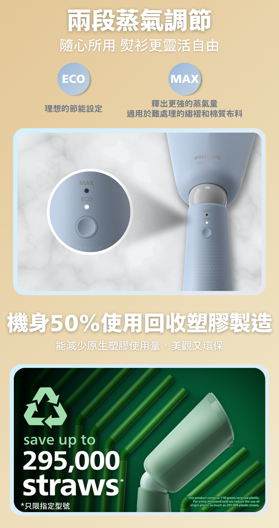 每售出 1,000 部 Philips 手提式蒸氣掛熨機 5000,我們就能減少多達 295,000 條膠飲管的原生塑膠使用量。因此,您不僅在穿上衣服後會感覺良好,而在使用蒸氣熨燙時亦然。