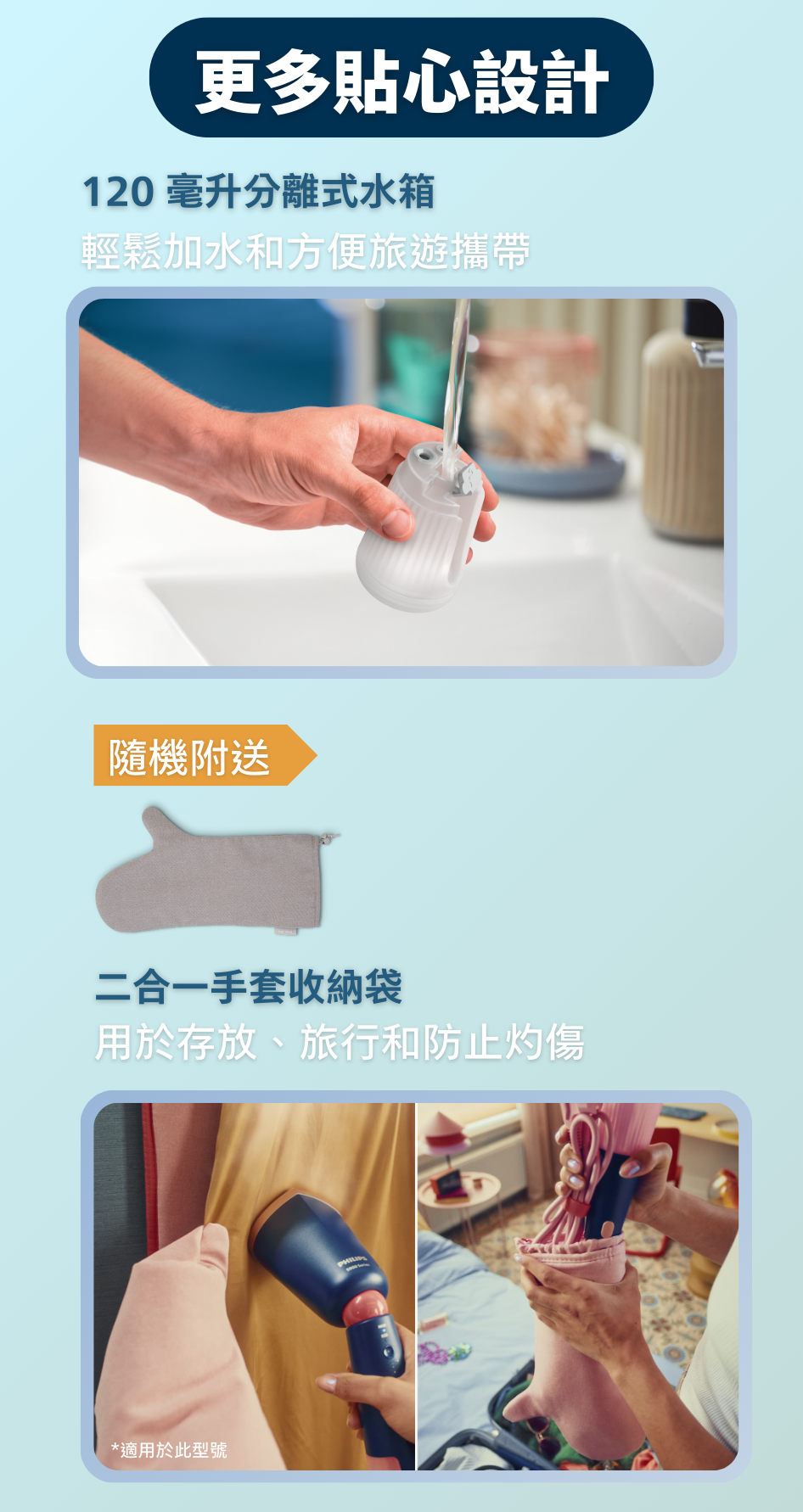 Philips 手提式蒸氣掛熨機 5000 配備二合一旅行配件,無論您到哪裡,都可以整齊收納並避免碰撞。即使您隨身攜帶什麼衣服,都可以在幾分鐘內以蒸氣安全處理,同時可用作安全手套,進一步保護您在家中或外出時免受蒸氣意外灼傷。