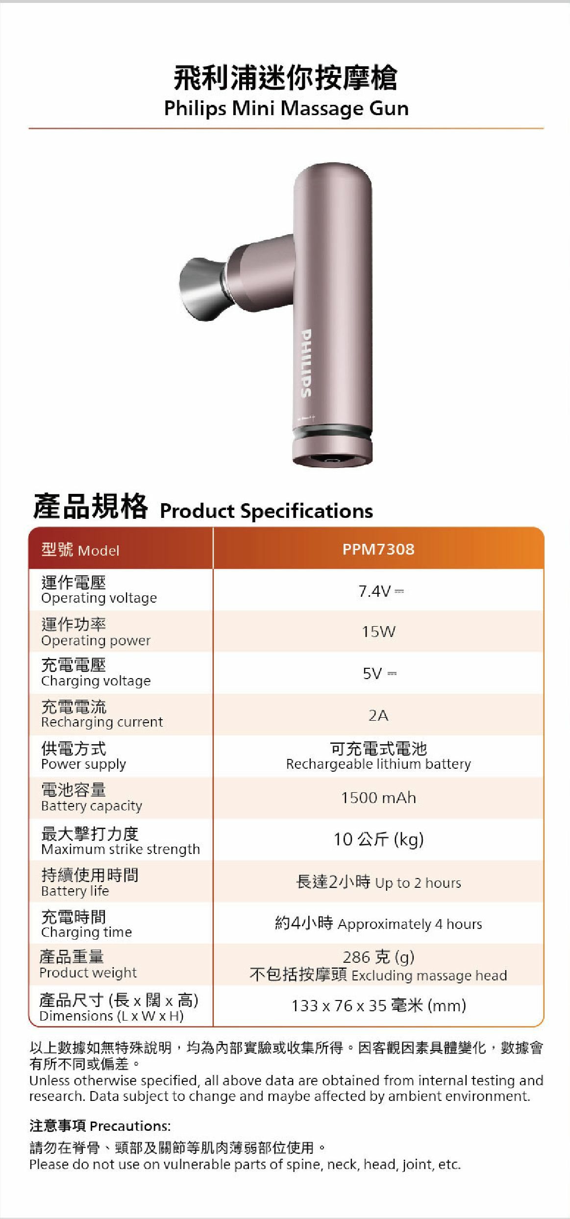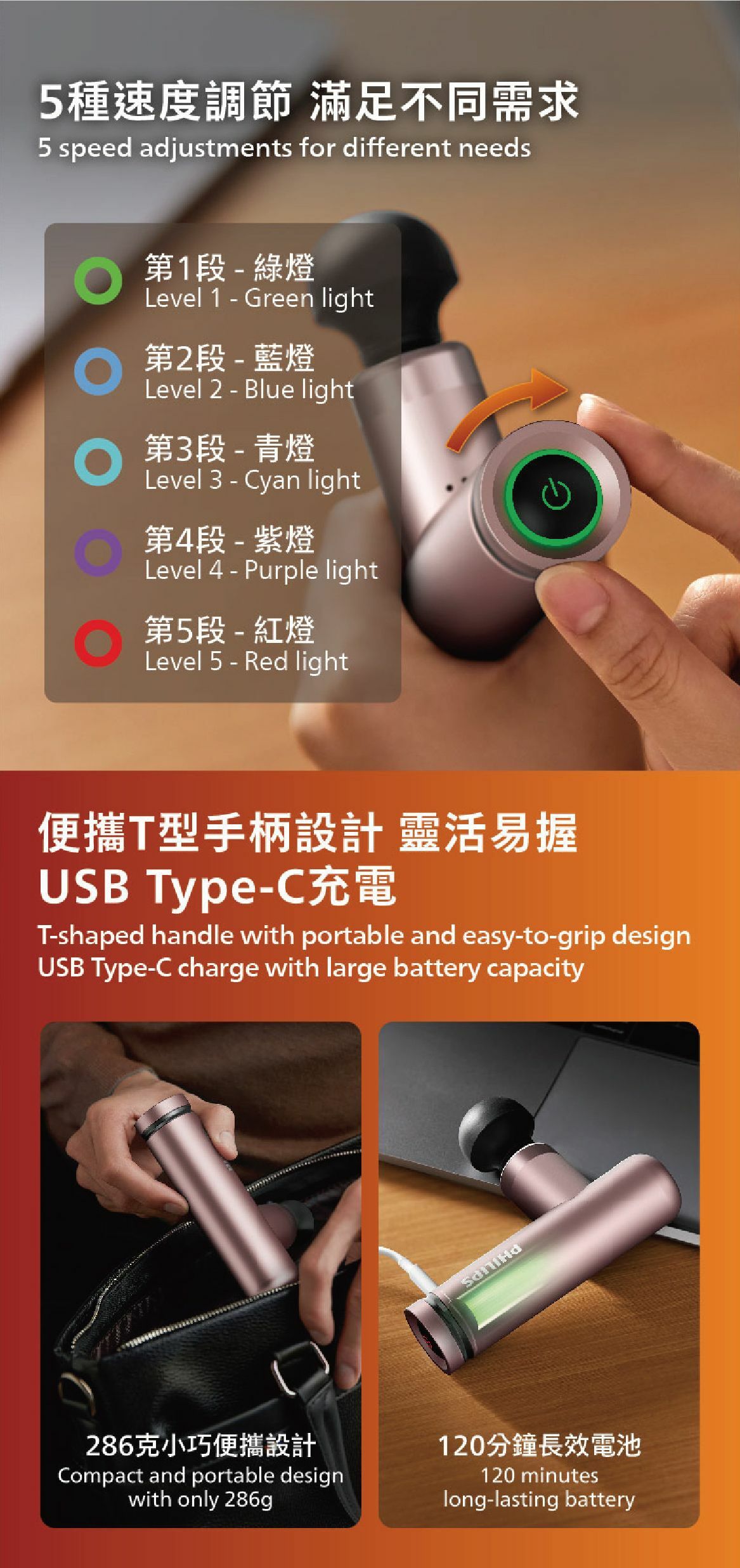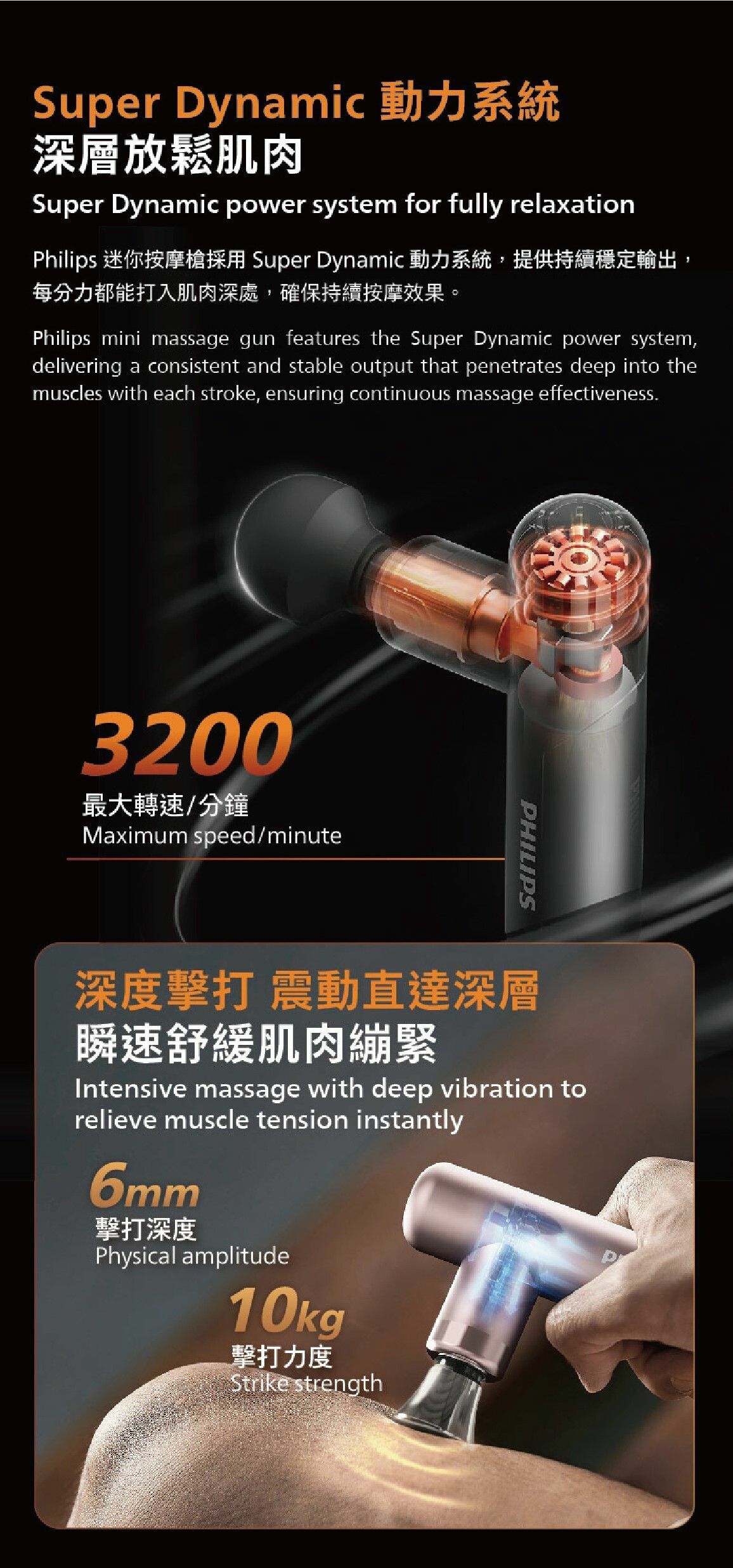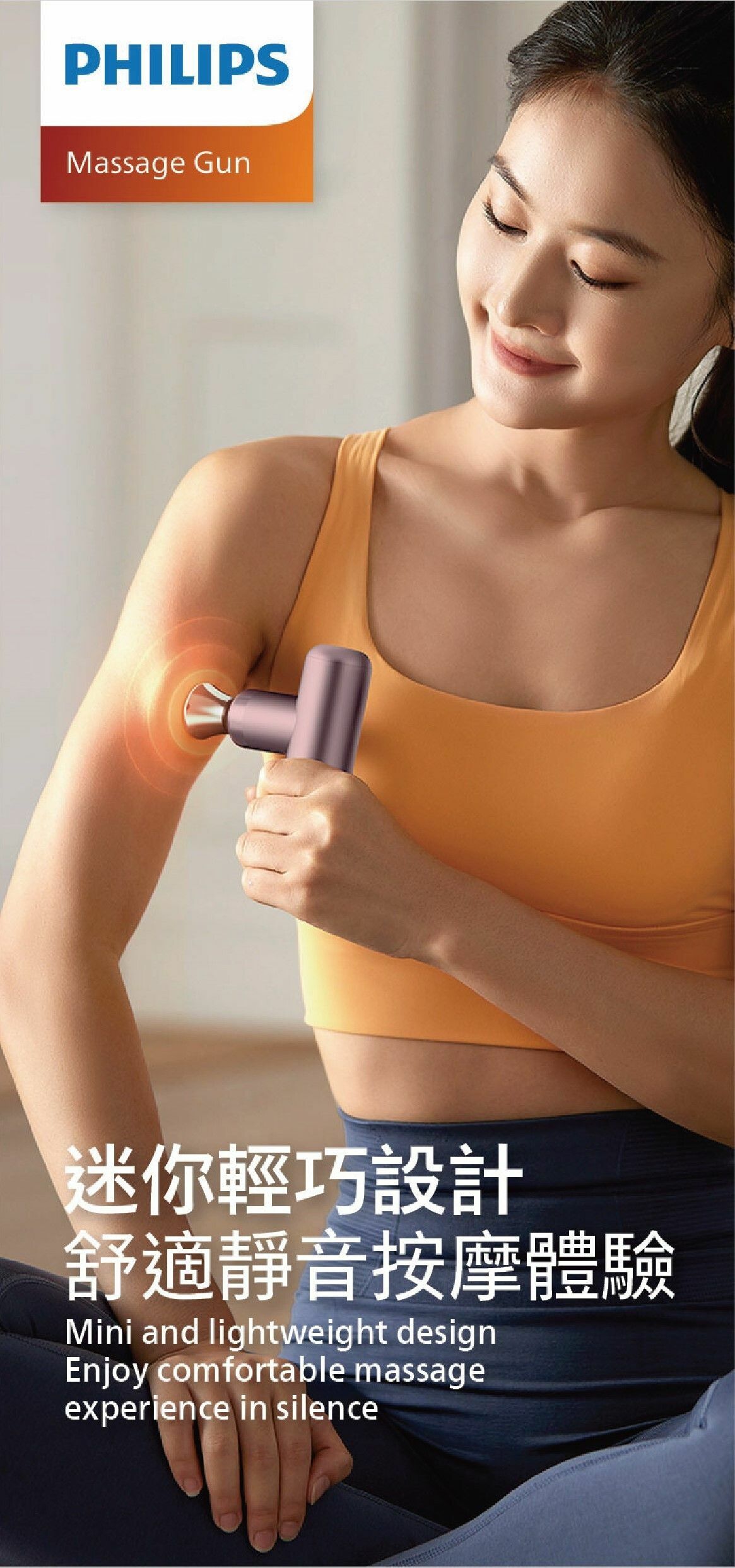 Philips PPM7308 運動迷你按摩槍<香港行貨> 提供舒適按摩體驗,幫助舒緩肌肉疲勞和緊張感,讓您恢復活力和舒適感。