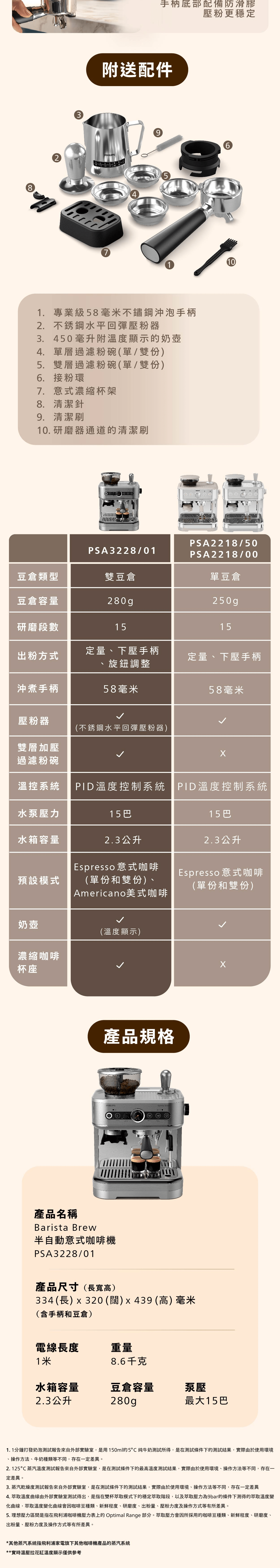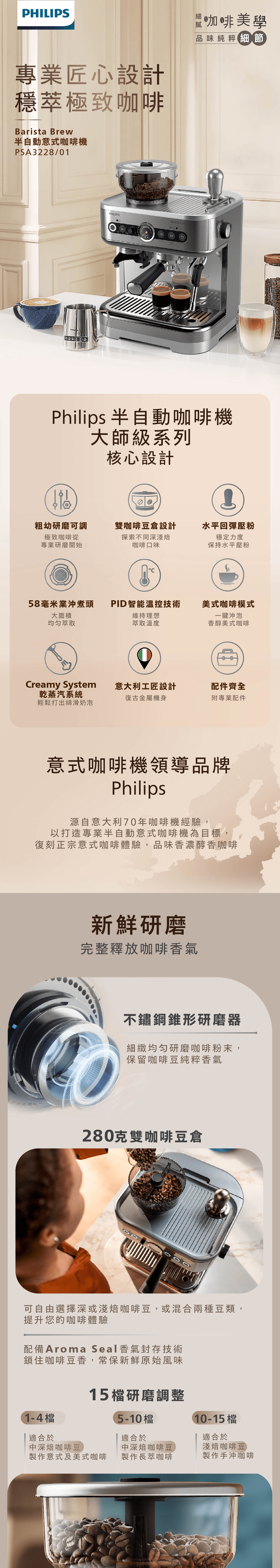 飛利浦 Philips PSA3228/01 Barista Brew 半自動特濃咖啡機,您的咖啡師創意,只需一點指導。盡情享受新鮮特濃咖啡的濃郁香氣。使用 Philips Barista Brew 特濃咖啡機體驗自己製作咖啡的滿足感,旨在幫助真正的咖啡愛好者透過每杯咖啡來提升自己的技能。