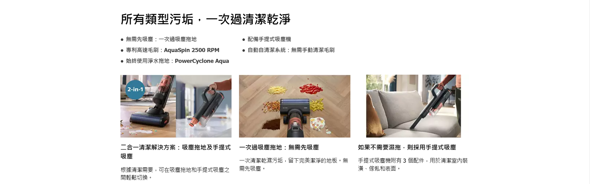 飛利浦 Philips XW6264/11 6000系列 全效無線吸塵洗地機,二合一功能,吸塵同時洗地。一次過清除灰塵、污垢、污漬、液體污物和細菌;無需先吸塵。切換到「手持」設定,輕鬆清潔室內裝飾、傢俬和底座。