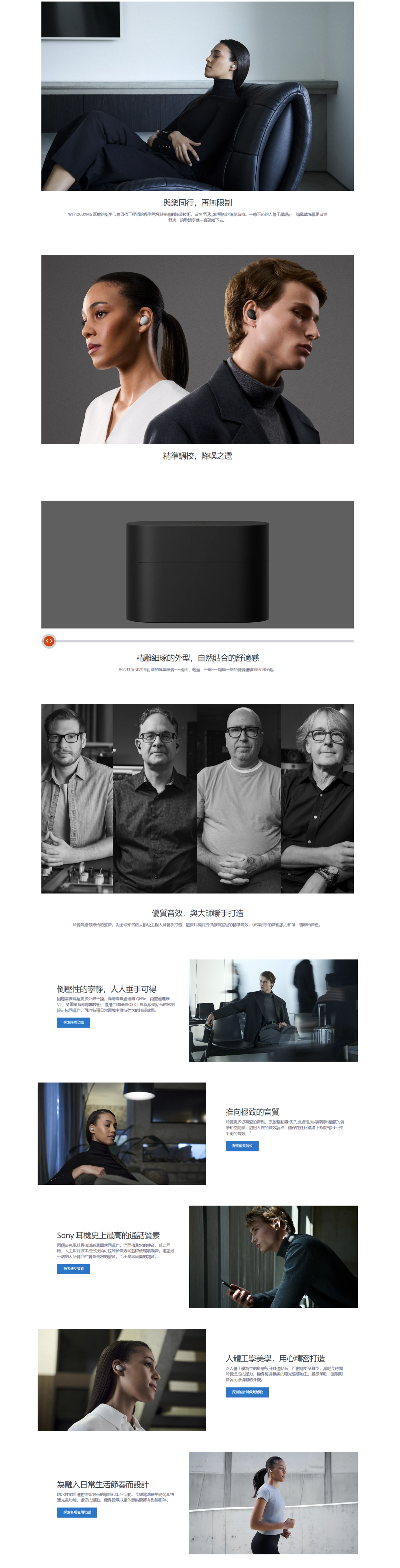 WF-1000XM6 耳機的誕生仰賴母帶工程師的獨到見解與先進的降噪技術,旨在呈現忠於原貌的細膩音效。一絲不苟的人體工學設計,讓佩戴感覺更自然舒適,讓聆聽享受一直延續下去