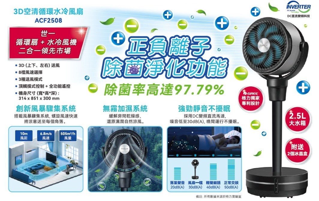 Tosot 大松 ACF2508 3D空清循環 水冷風扇結合了空氣清新和循環循環功能,提供清新涼爽的空氣,讓您享受舒適生活。這款風扇設計先進,操作簡便,適用於各種場合。