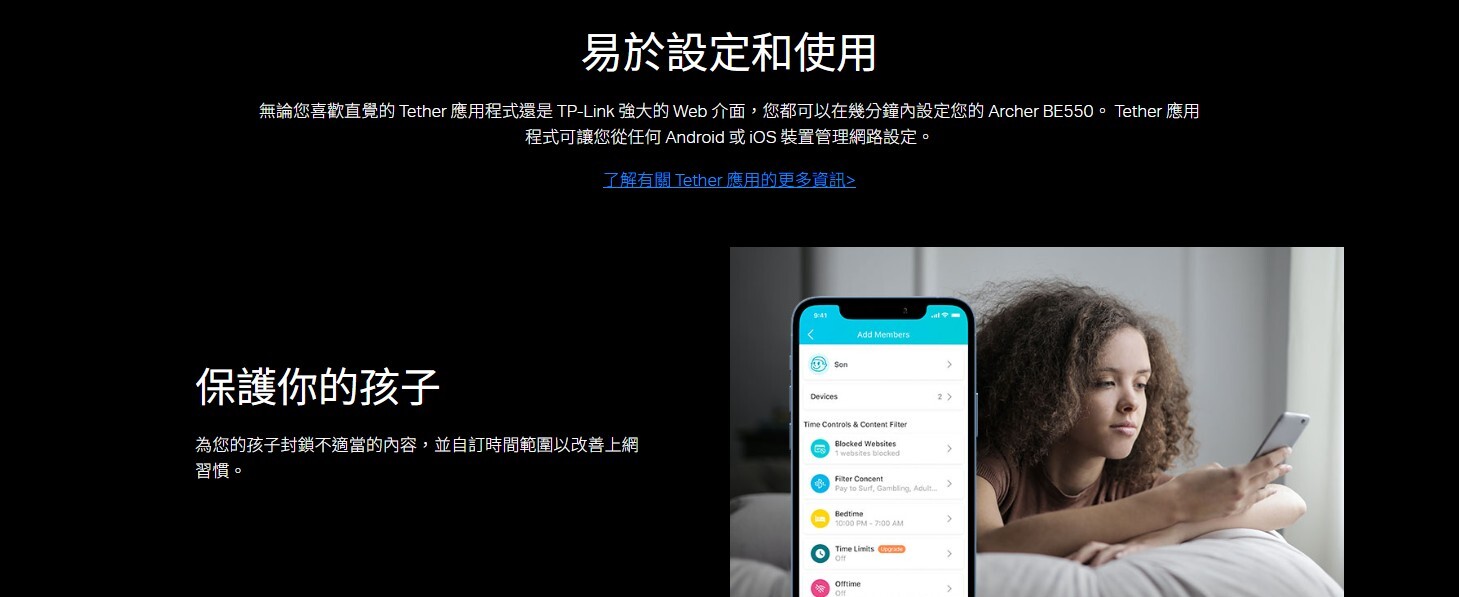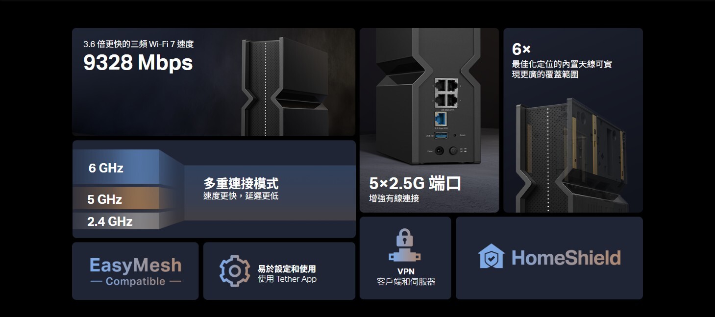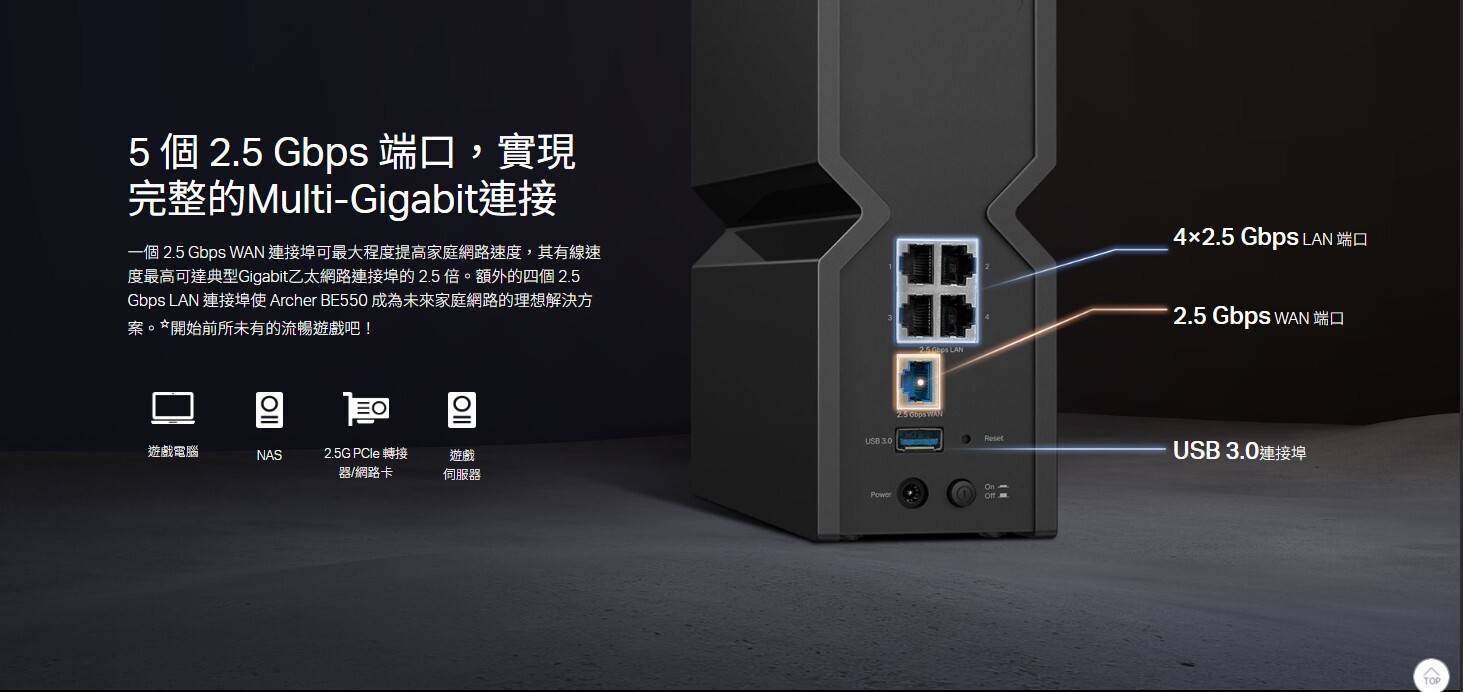 Archer BE550 Pro 配備 9.7 Gbps 三頻 Wi-Fi、一個 10G WAN、四個 2.5G LAN 和一個 USB 3.0,加上320 MHz 超寬頻道及MLO技術,充分發揮 6 GHz 頻段的潛力,為 8K 串流和高速下載提供卓越體驗。Archer BE550 Pro 亦支援EasyMesh,如果家中有Wi-Fi 盲區,只需添加一個支援EasyMesh的路由器/ 擴展器,經簡單設定即可組成Mesh Wi-Fi,輕鬆解決接收問題。