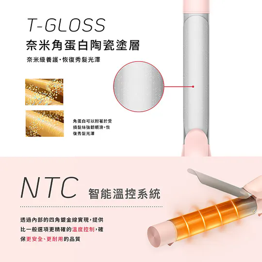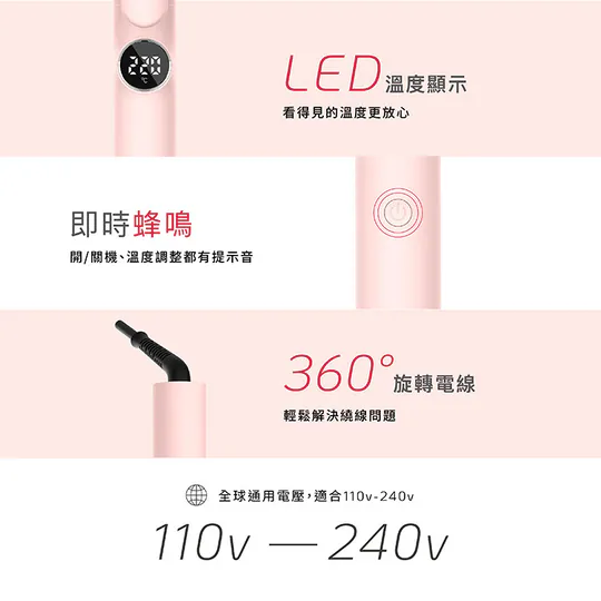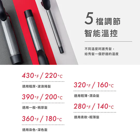 只需選擇您的捲筒尺寸,插上插頭,開啟電源,LED屏幕顯示溫度,5個溫度設定從140°C至230℃應對各種髮質和造型需求,同時通過60分鐘自動關機功能確保您的安全。先進的NTC控制系統和鍍金內部線提供精確的溫度控制,助您隨心打造理想髮型。