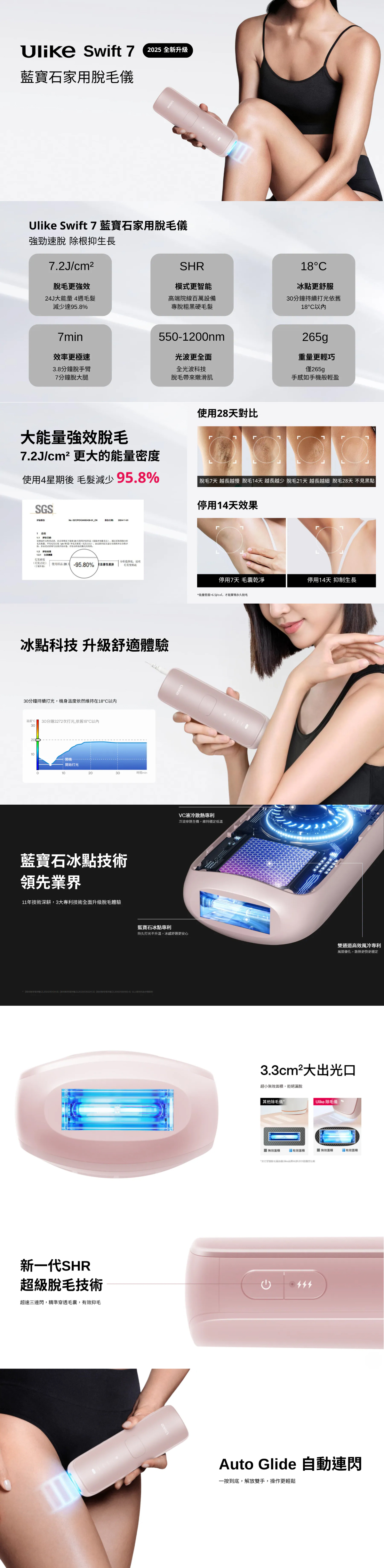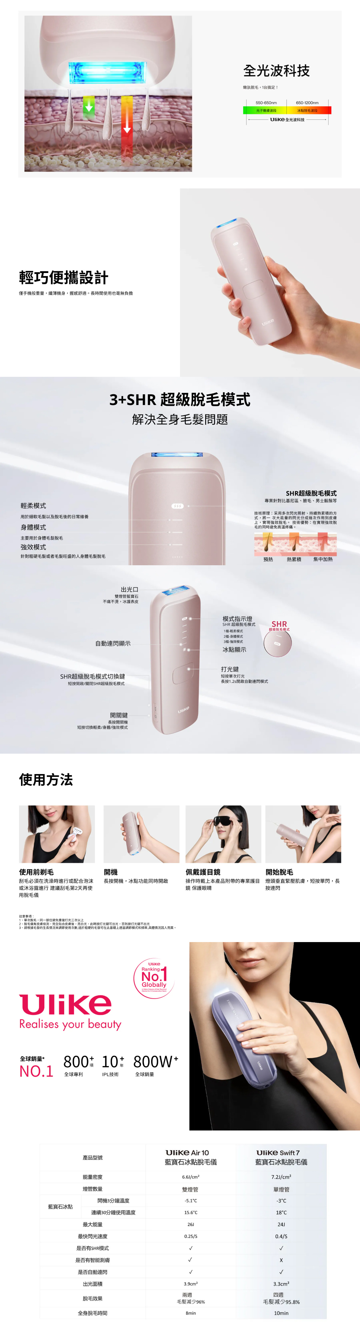 Ulike Swift 7 藍寶石家用脫毛儀採用尖端科技,提供有效的脫毛解決方案,讓您在家中輕鬆享受專業脫毛體驗。這款脫毛儀安全且方便,適合各種皮膚類型使用。