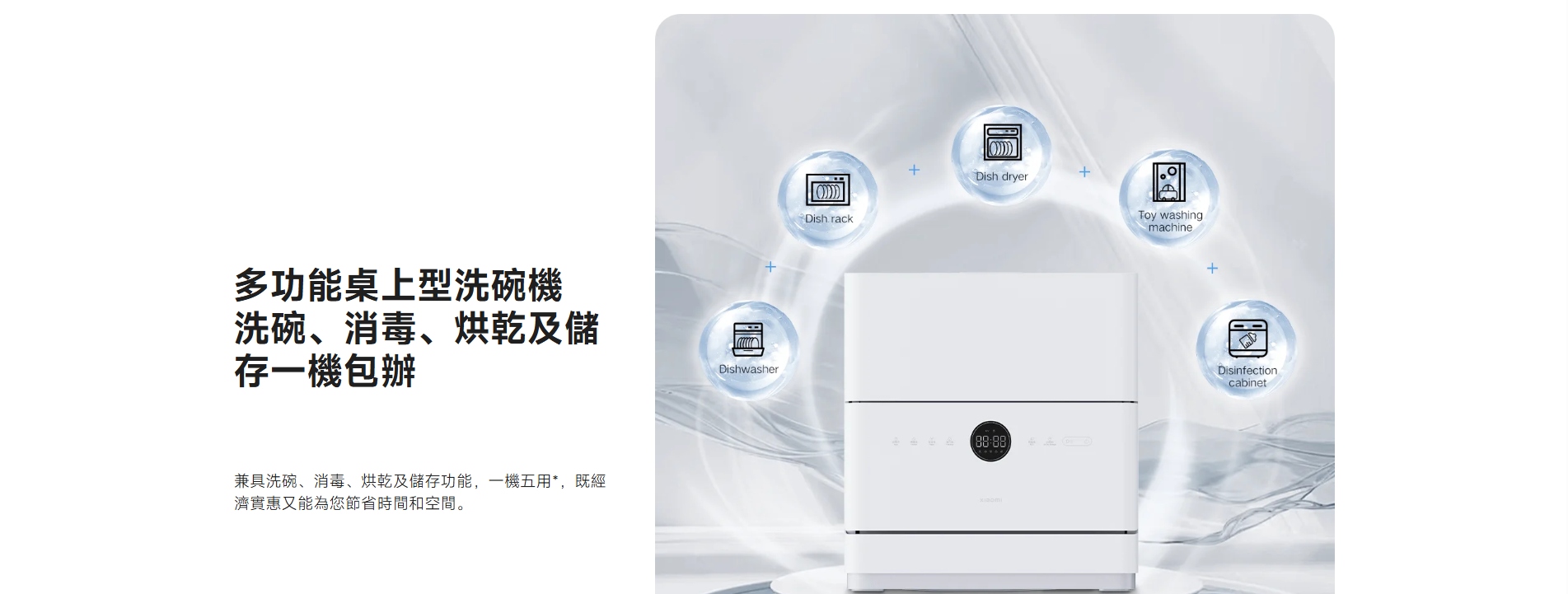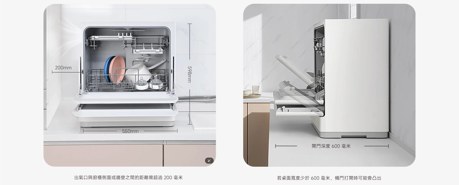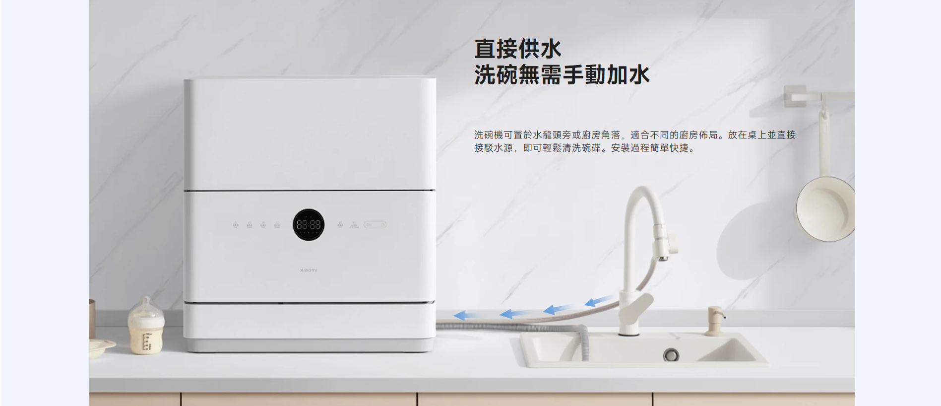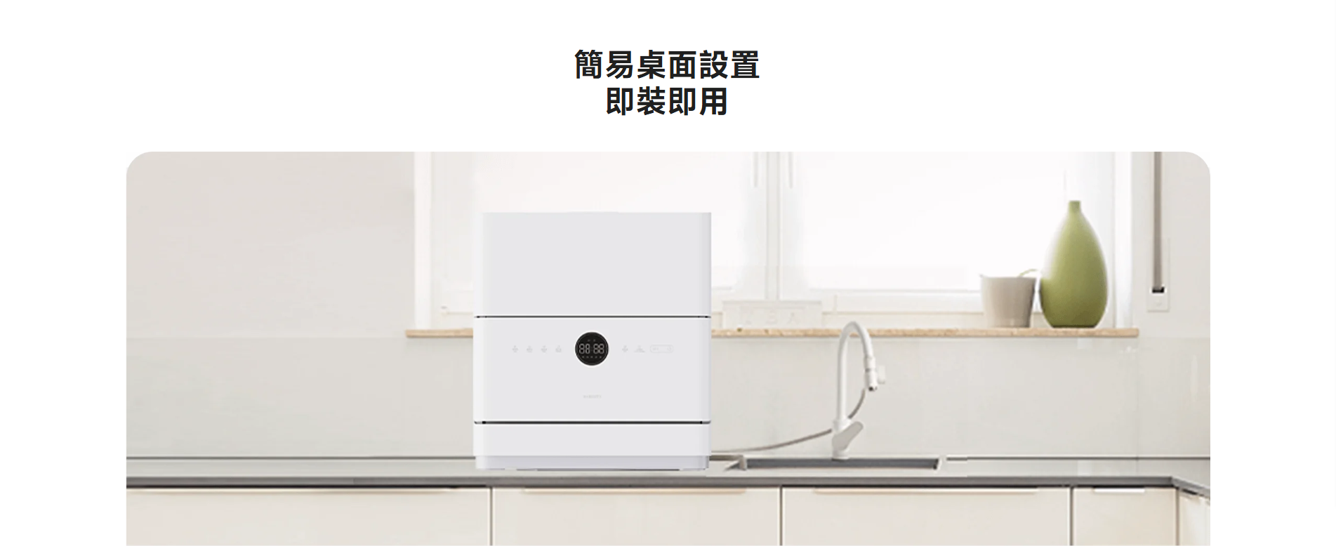 Xiaomi 桌上型洗碗機 (型號:QMDW0503M),超薄機身配搭摺門設計,小巧家電融入生活空間。