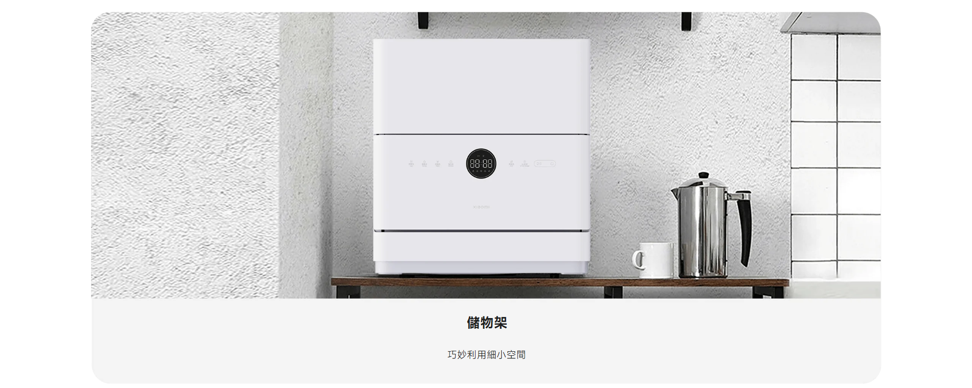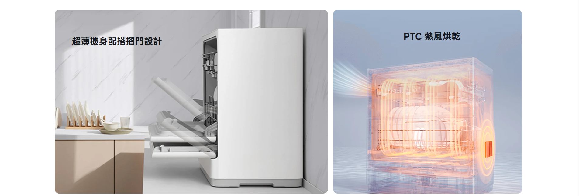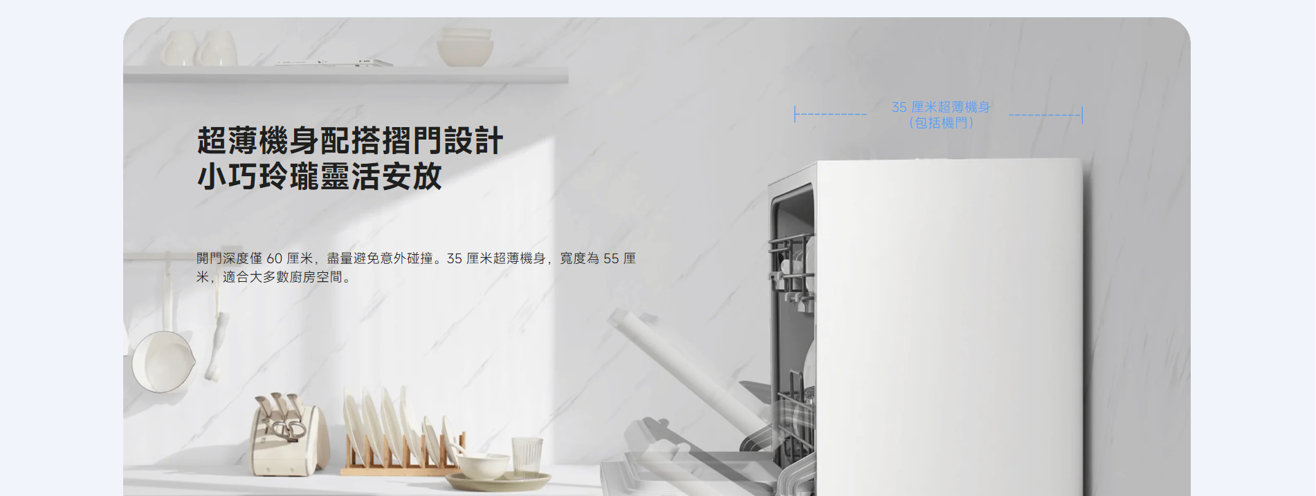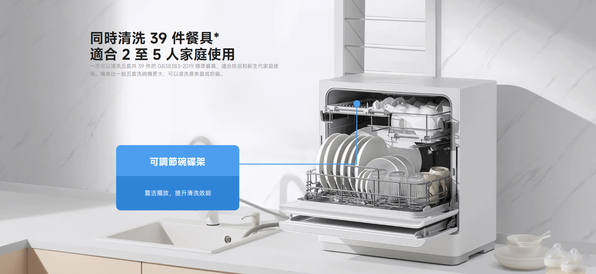 Xiaomi 桌上型洗碗機 (型號:QMDW0503M),超薄機身配搭摺門設計,小巧家電融入生活空間。