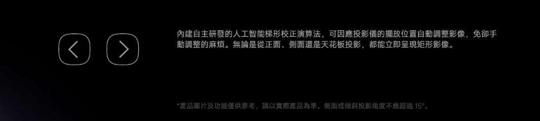 內建自主研發的人工智能梯形校正演算法,可因應投影儀的擺放位置自動調整影像,免卻手動調整的麻煩。無論是從正面、側面還是天花板投影,都能立即呈現矩形影像。