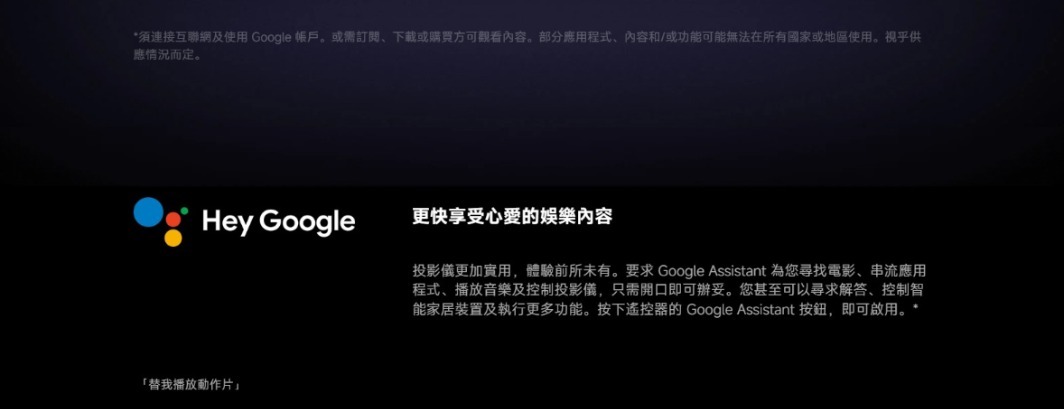 投影儀更加實用,體驗前所未有。要求 Google Assistant 為您尋找電影、串流應用程式、播放音樂及控制投影儀,只需開口即可辦妥。您甚至可以尋求解答、控制智能家居裝置及執行更多功能。按下遙控器的 Google Assistant 按鈕,即可啟用。*