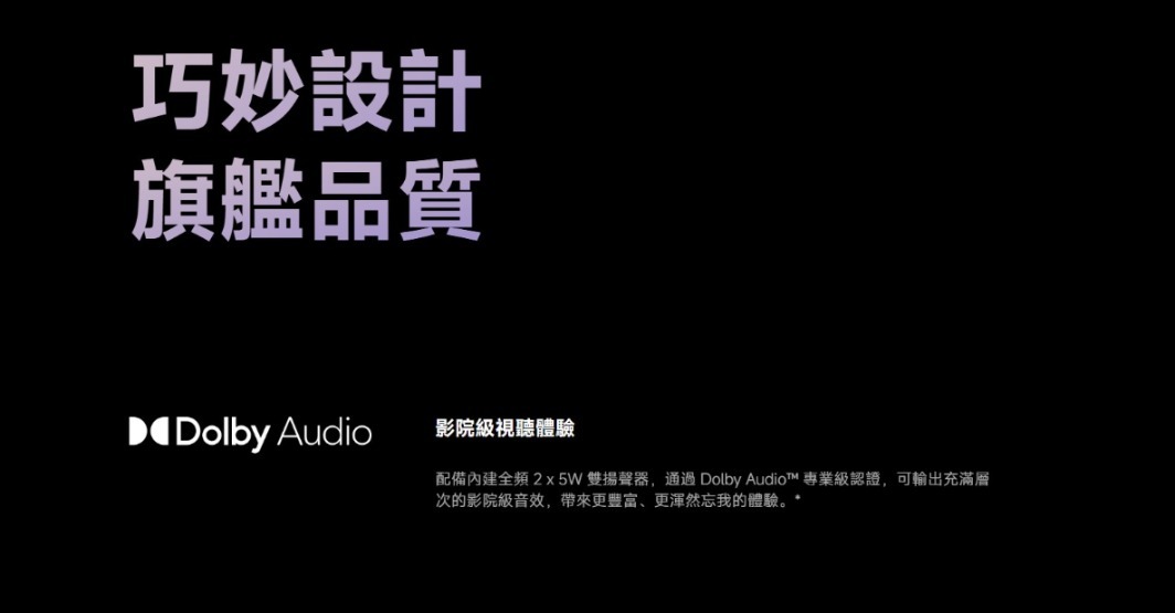 配備內建全頻 2 x 5W 雙揚聲器,通過 Dolby Audio™ 專業級認證,可輸出充滿層次的影院級音效,帶來更豐富、更渾然忘我的體驗。*
