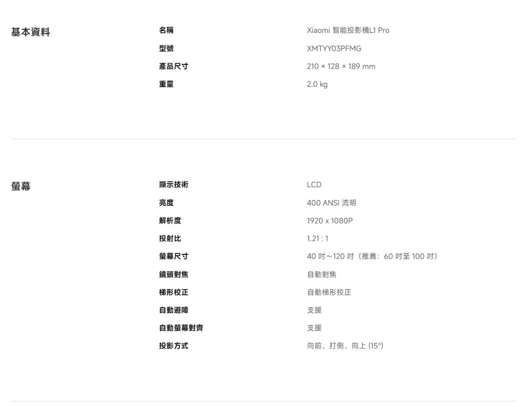 螢幕尺寸: 40 吋~120 吋(推薦:60 吋至 100 吋)