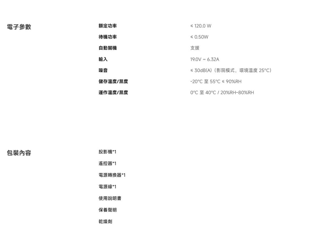 噪音: ≤ 30dB(A)(影院模式,環境溫度 25°C)