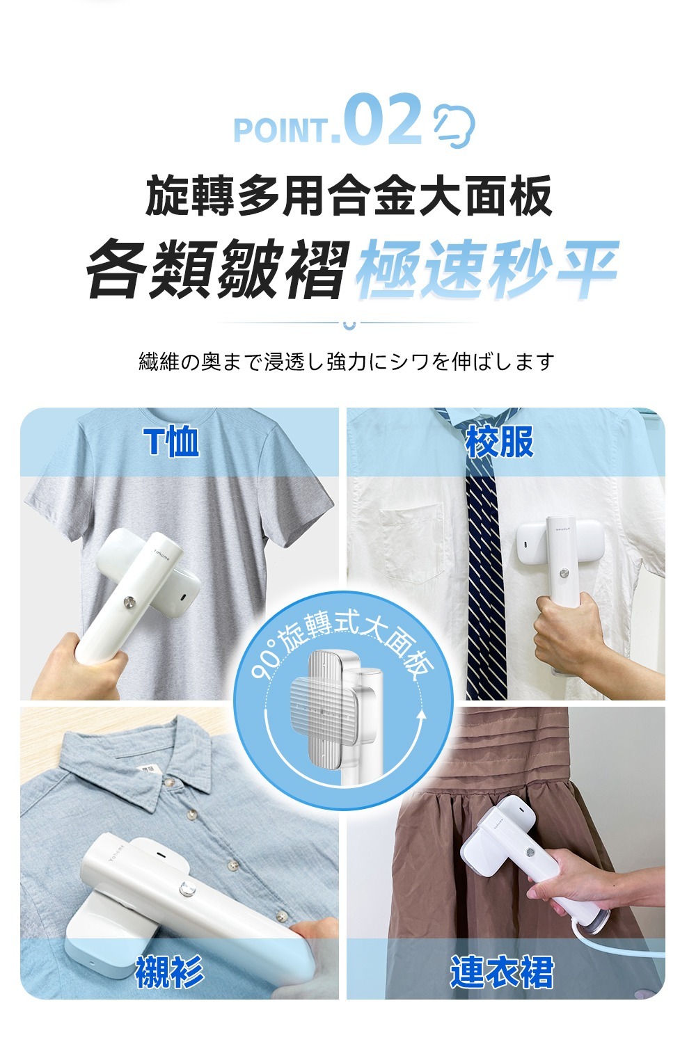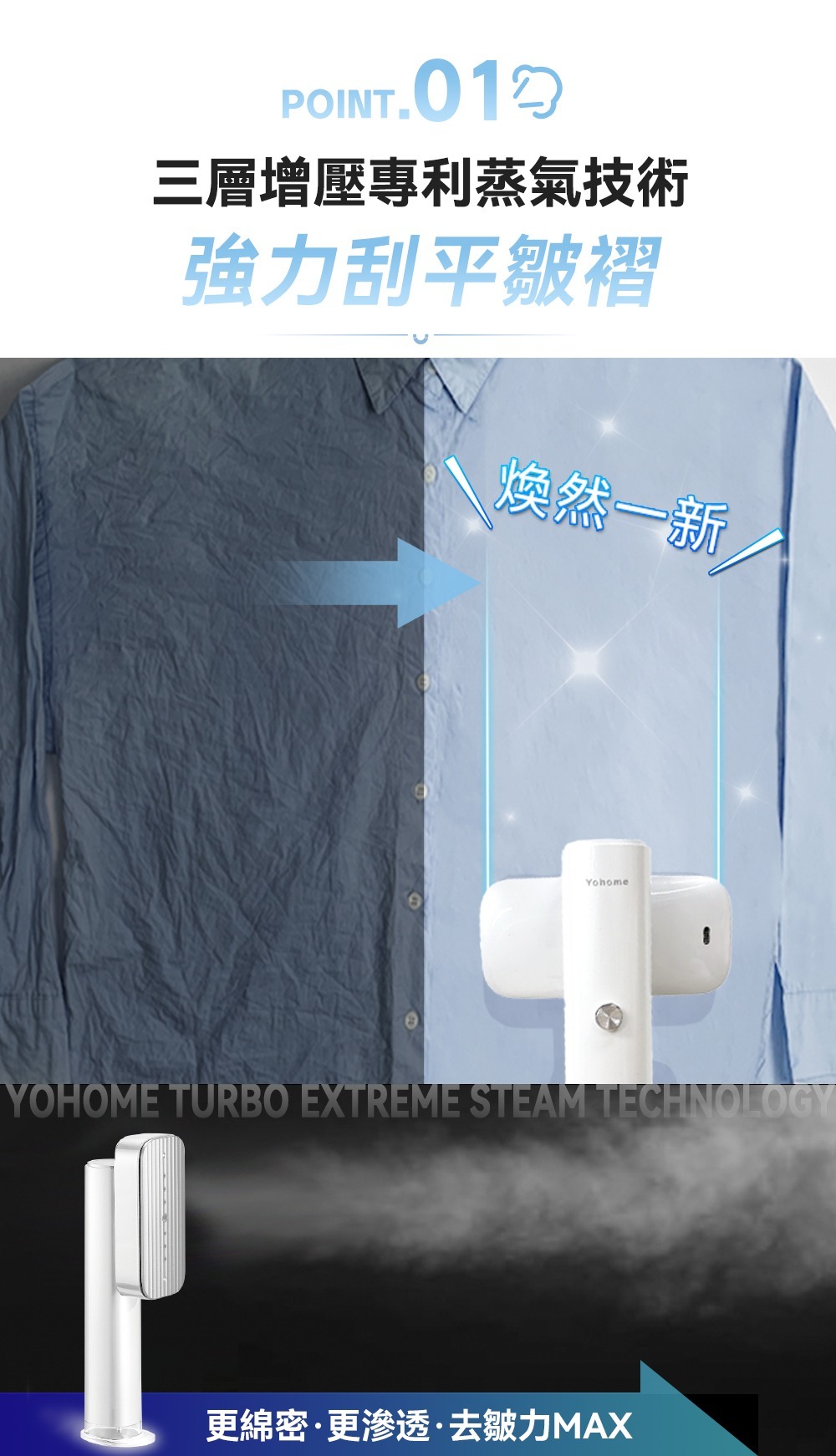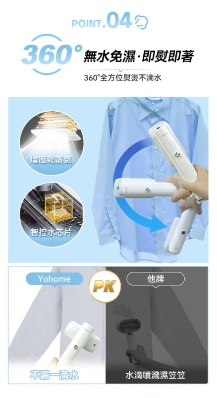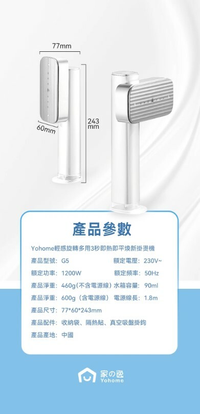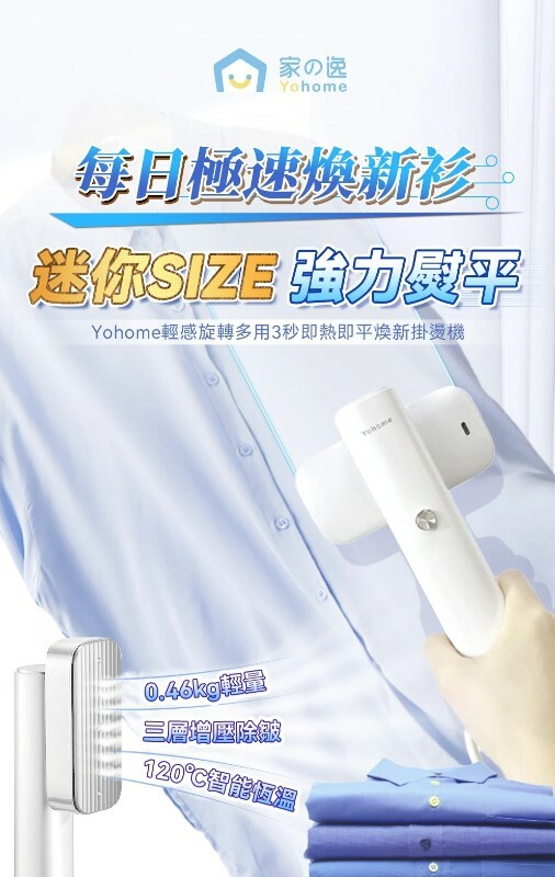 Yohome 輕感旋轉多用3秒即熱即平煥新掛燙機 120℃恒溫蒸汽,10-15s疾速預熱不久等,升級增大水箱+立式設計,熨燙頭可順時針旋轉90°,使用更便捷,適用各種材質衣物且不傷衣,讓您輕鬆享受高效熨燙的便利和舒適。