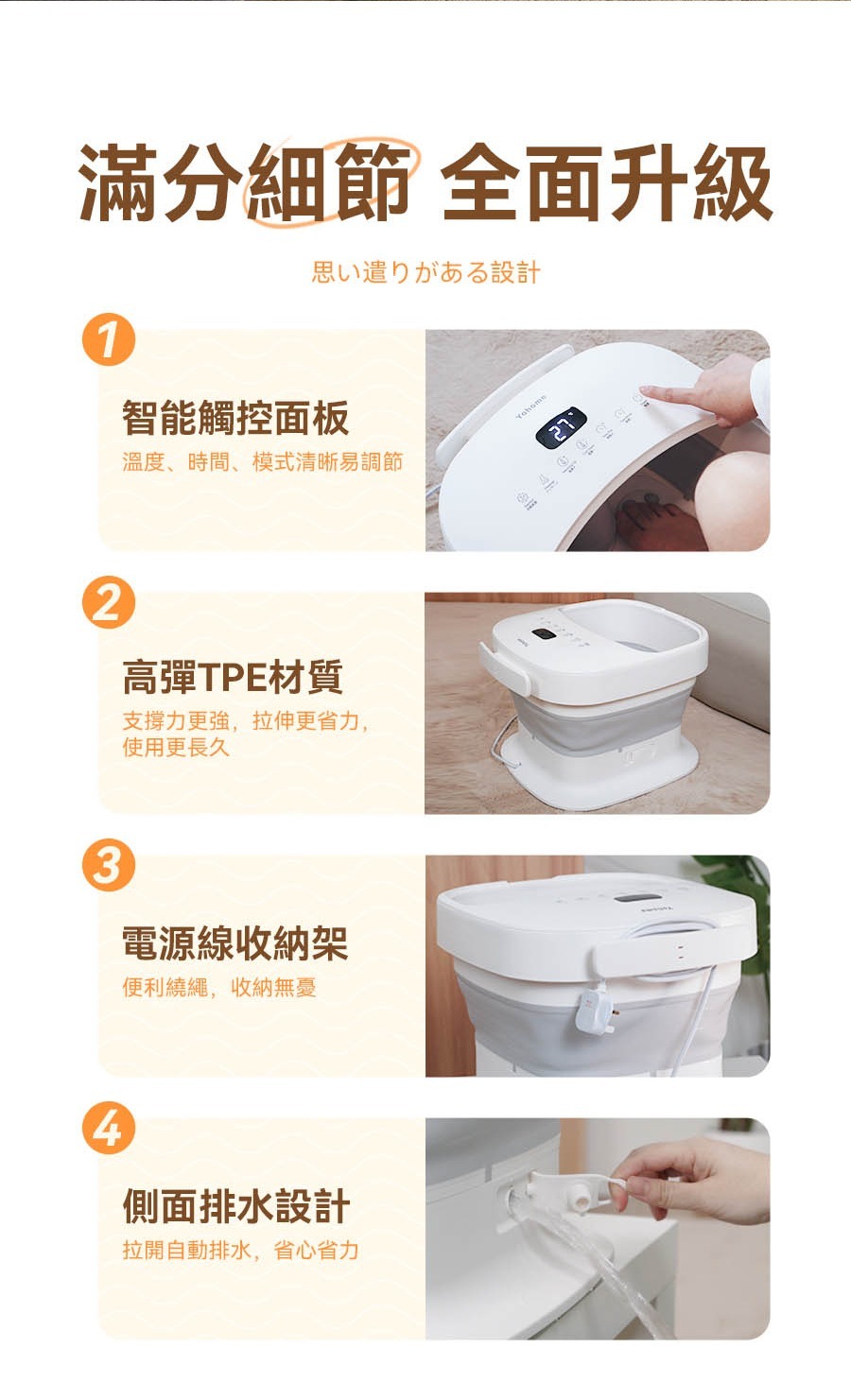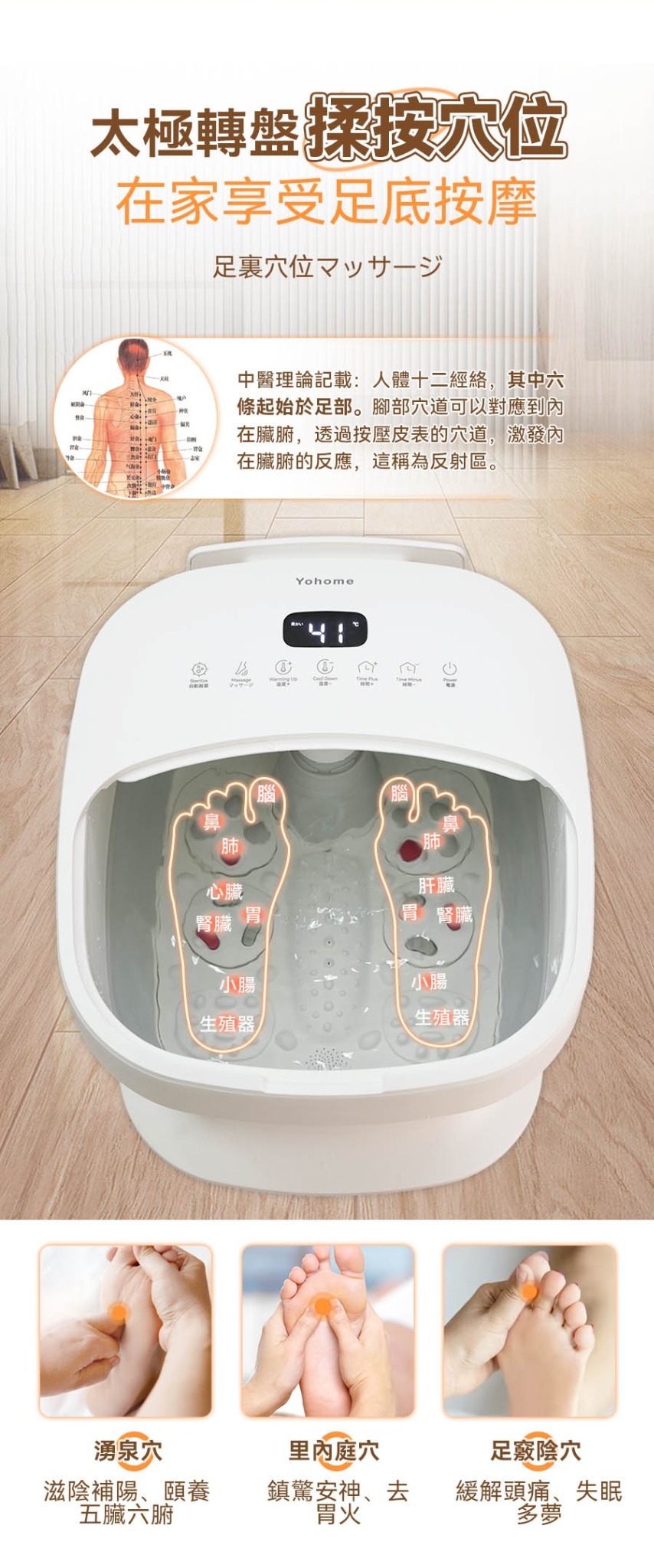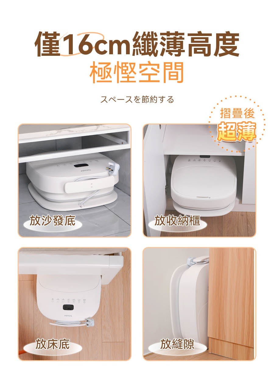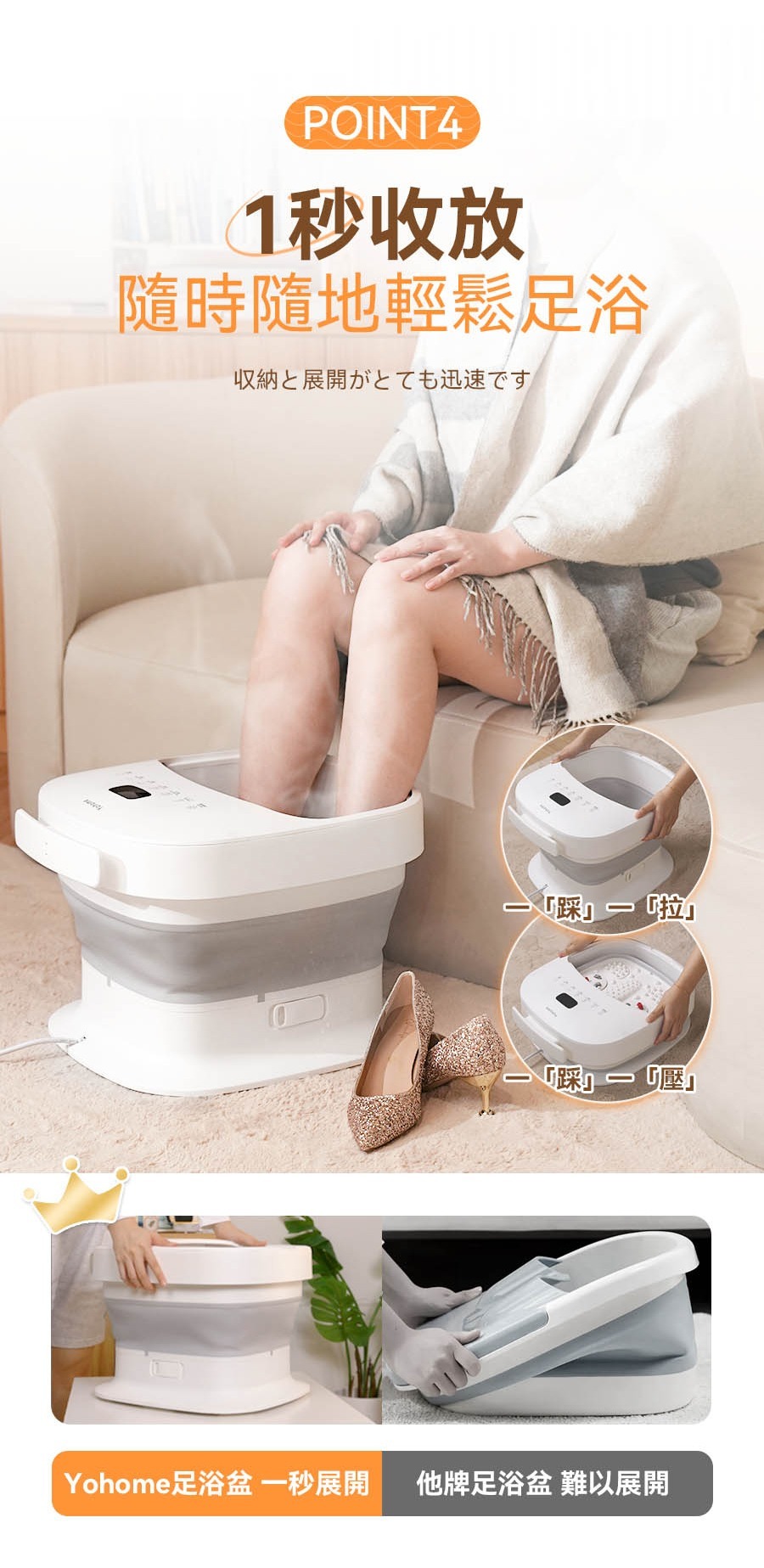 Yohome 3D智能揉按足穴恆溫殺菌折疊足浴盆擁有智能調溫功能,自由搭配按摩轉盤,腳踩秒打開,輕鬆收納折疊後僅16cm高度,紫外線循環殺菌,絕緣+水電分離設計,為您帶來舒適安全和衛生的足浴體驗。