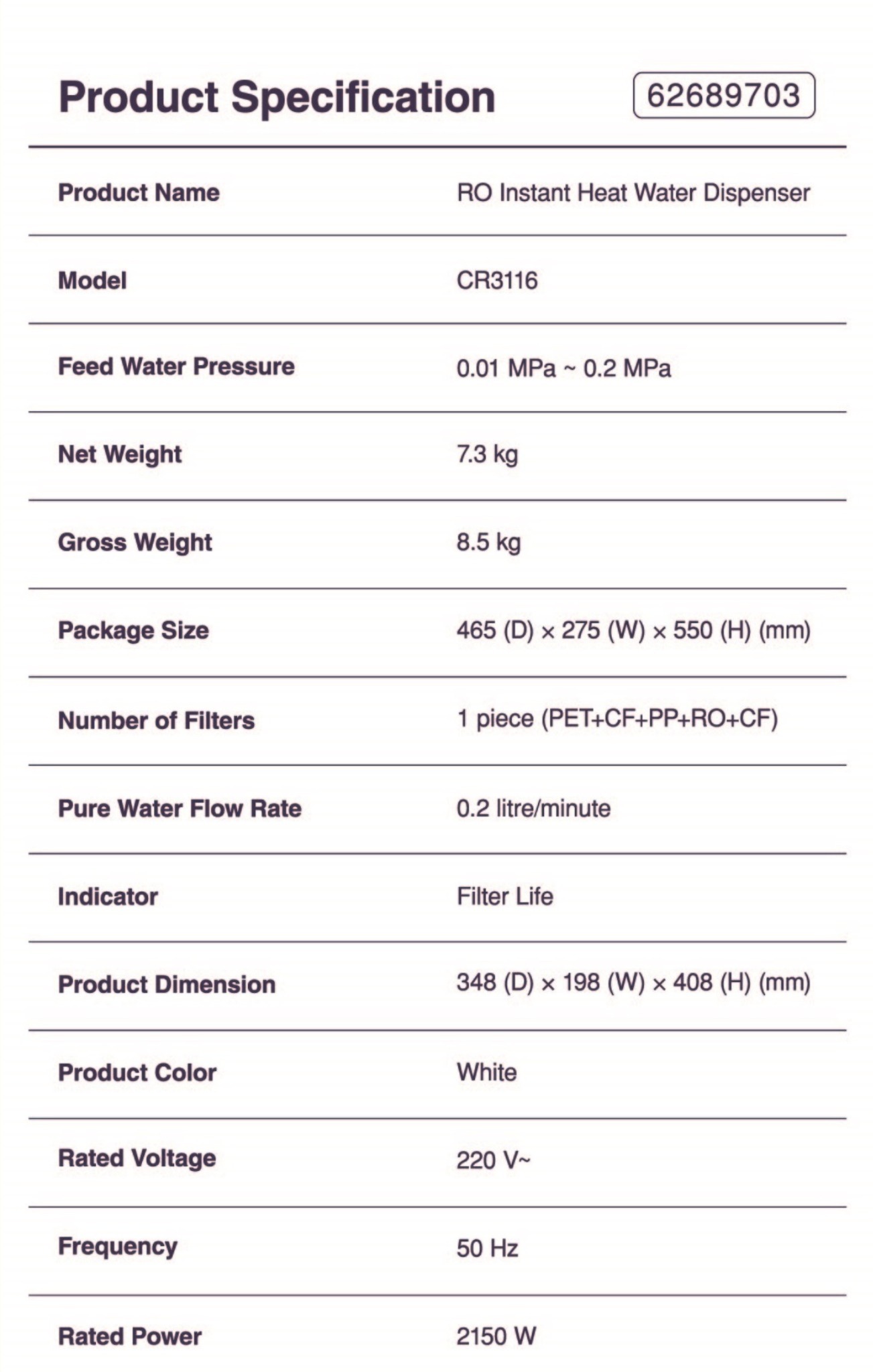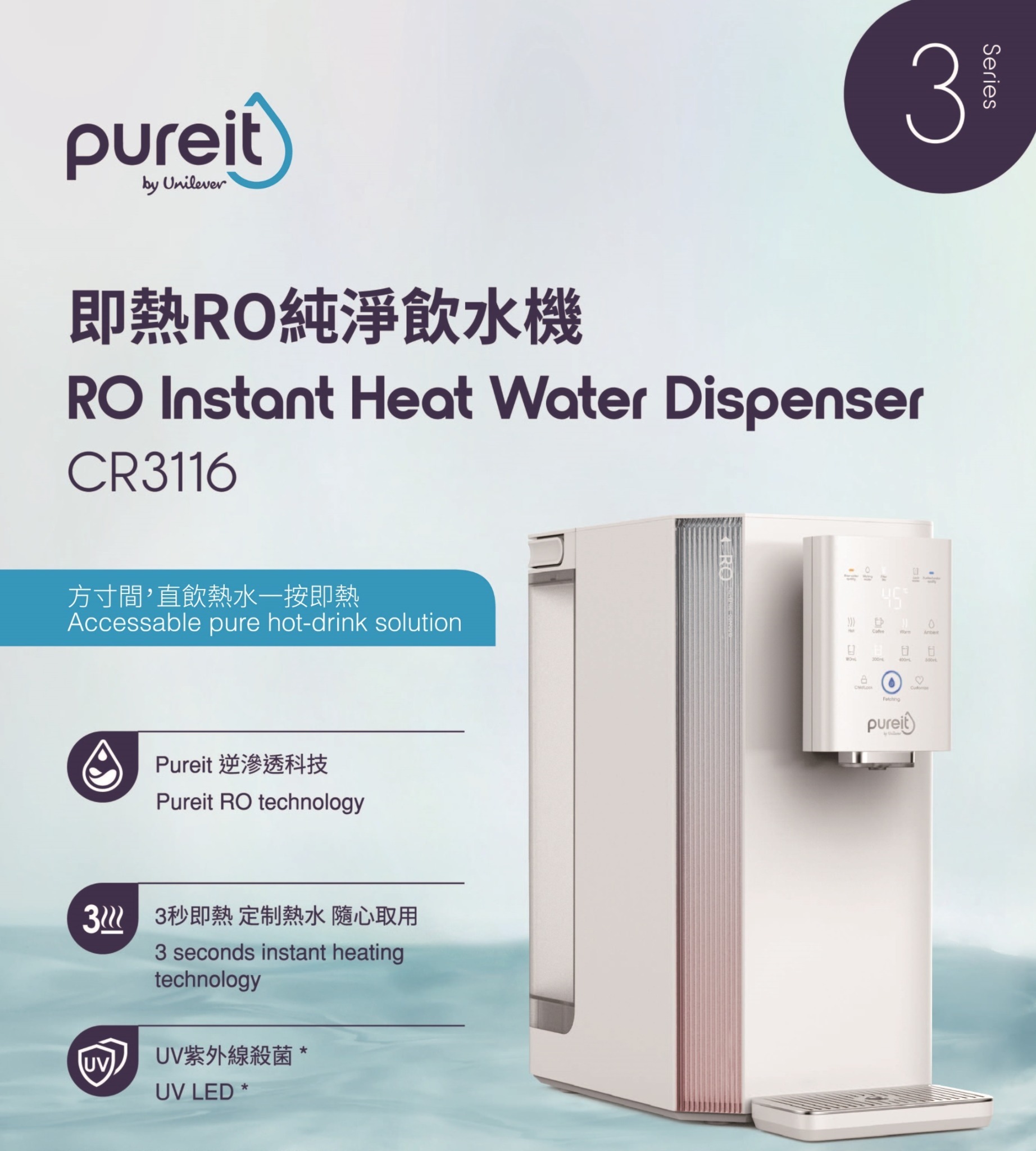 PureitCR3116 RO 即熱純淨飲水機為您提供即時純淨飲用水,滿足您的飲水需求。這款飲水機採用RO技術,過濾水質,確保飲用水的純淨和安全。